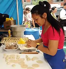 As for the Himalayan momo, it is not quite known whether it spread from the Kathmandu valley of Nepal to Tibet or the other way around. Because this dish was initially popular among the Newar community of the Kathmandu Valley of Nepal, one prevalent belief is that traveling Nepali Newar merchants took the recipe from Tibet, where they traded, and brought it home to Nepal.[9] Some argue that momos were introduced in Tibet by a Nepalese Newari princess who was married to a Tibetan king in the late fifteenth century, since in Newari, one of Nepal's oldest languages, ‘mome’ means cooking by steaming.[8] In Tibet, the filling of the dish was typically meat, such as yak and occasionally potatoes and cheese. Traditional Tibetan momos are quite different from the Nepalese one as the former was made with a thicker dough and with little to no spices except salt. However, after arriving in the Indo-Gangetic Plains, the meat became chicken, and mixed vegetable momos were introduced to feed the large population of vegetarian Hindus.[10] A large number of Tibetans emigrated to India following the 1959 Tibetan uprising, bringing their recipes for momos with them.[3] Unproven, but substantiated by the dates and references to momos in colloquial references, the civil war in Nepal pushed out the Nepali diaspora to seek a livelihood in India, which further increased the prevalence of Himalayan style momos in the southern half of India especially in the cities of Chennai and Bangalore.