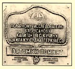 Russian scholars deem that Vladimir Rusanov and his ill-fated party disappeared somewhere around the area of the Mona Islands. Relics were found in 1934 in Gerkules Island, including a wooden pole with the inscription "Gerkules 1913", broken old sledges and a fragment of a cartridge box.[1] Other remainders were found in Popova Chukchina, an island of another group not far away (Kolosovykh Islands) during and expedition organized in 1937 by the Arctic Institute of the Soviet Union.