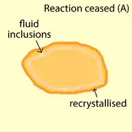 There are basically two factors which can cause the reaction to cease. (A) Reaction ceases due to the recrystallisation of precipitating phase, removing all the fluid infiltration paths. This results in fluid inclusions in monazite. (B) Reaction ceases due to a change in the system such as the composition of fluid and monazite, making this reaction no longer reactive.[13]