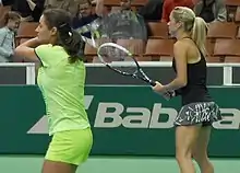 Her 2018 season started with playing at the Hobart International; she advanced to the quarterfinals after two wins but was then forced to withdraw.[19] Despite losing in the first round of the singles event at the Australian Open, she managed to reach semifinals in doubles, partnering with Begu. Next, she advanced to another quarterfinal at the Taiwan Open, but lost to Lisicki, in three sets. At the WTA 1000 Qatar Open she beat Maria Sharapova in the first round,[20] followed up with a win over Magdaléna Rybáriková. In the following round, she lost to Caroline Wozniacki. A month later, she reached another WTA 1000 third round, this time at the Miami Open. In the third round, she was forced to retire during the third set against Sloane Stephens due to injurt.[21] She played in the first round of Wimbledon, Canadian Open, US Open and Wuhan Open. On the 2 April 2018, she reached a career-high doubles ranking of 11.