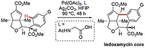 The development of MPAA ligands enabled and improved the synthesis of many complex natural products. Examples include Arnottin 1,[26] Aspercylide B,[27] Berkelic Acid,[28] Boletopsin 11,[29] Danshenspiroketallactone,[29] Delavatine A,[30] Herbindole B/cis-Trikentrin A,[31] Hongoquercin A,[32] Incarviatone A,[33] Indoxamycin,[34] Kedarcidin/Neocarzinostatin,[35] Kinamycin[36]