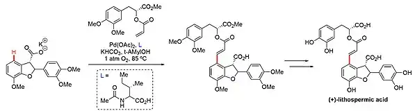- 1 2 Wang, Dong-Hui; Yu, Jin-Quan (2011-04-20). "Highly Convergent Total Synthesis of (+)-Lithospermic Acid via a Late-Stage Intermolecular C−H Olefination". Journal of the American Chemical Society. 133 (15): 5767–5769. doi:10.1021/ja2010225. ISSN 0002-7863. PMC 3085405. PMID 21443224.