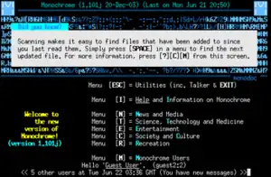 Monochrome BBS, known to users as "Mono," is a text-based multi-user bulletin board system featuring thousands of discussion files, along with games, user messaging, and a talker. As of November 2023 it is one of the few BBS's still in operation and actively used on a daily basis by its community. Monochrome runs on custom software, making the platform and user experience distinct from other bulletin board systems.