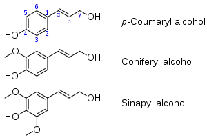 Monolignols, also called lignols, are the source materials for biosynthesis of both lignans and lignin and consist mainly of paracoumaryl alcohol (H), coniferyl alcohol (G) and sinapyl alcohol (S). These monolignols differ in their degree of methoxilation of the aromatic ring.[1]