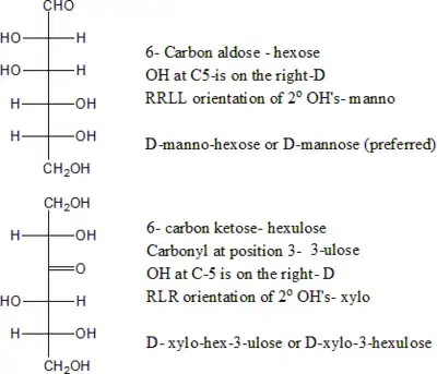 Monosaccharide nomenclature is the naming system of the building blocks of carbohydrates, the monosaccharides, which may be monomers or part of a larger polymer. Monosaccharides are subunits that cannot be further hydrolysed in to simpler units. Depending on the number of carbon atom they are further classified into trioses, tetroses, pentoses, hexoses etc., which is further classified in to aldoses and ketoses depending on the type of functional group present in them.[1]