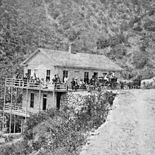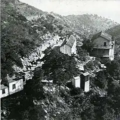 After acquiring the property, Curtiss first built a rustic camp and "permanent tents"[7] then series of "redwood shanties" as a resort, but these were burned in an 1871 fire.[5] In a report from 1873 in the Santa Barbara Morning Press, it was written that "a magnificent hotel costing $100,000" would be constructed at hot springs to serve the many tourists attracted to the area. A writer claimed that “Many a rheumatic and neuralgic cripple has left his crutches here as a momento to the healing touches of the waters, and gone down from the rocky mountain glen out into the gay world, shouting praises to the boiling fountain which has invested him with new life.”[7] Curtiss rebuilt a three-story hotel after the fire that included a dining room, however it was not a lucrative business, and in 1877 the property was repossessed and sold by the county sheriff.[5] Another account states that "By 1877 there was a large plunge, a shower, and three bath houses, each containing large tubs-enough in all to handle forty people."[7] Over the next ten years the property was owned by several different parties. In 1878, visitors could enjoy unlimited use of the hot springs, for the price of $2.00 per day for room and board.[5]