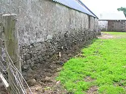 As stated, the old castle was robbed of stone to build the dam and threshing mill in the early 19th century. Threshing is the separation of the grain of a crop from the straw. Originally by hand, the Scot Andrew Meikle of East Linton in 1786 developed a threshing machine, housed in a threshing mill. The corn was fed in at the first floor level and rollers with grid-like brushes on separated the grain from the straw. The grain passed through the grid. The grain was bagged up for the millstones, the straw taken to the straw barn. A gathering or mill pond, leats and sluices were needed.[7] The water supply came from the hill above and remains of the control sluice are still visible, with an overflow running through a pipe to the Montfode Burn and the 'spent' water from the mill leaving via a substantial stone lined outflow that exited below the main farm buildings. A turbine may have been used as no signs of a waterwheel and associated equipment exist.
