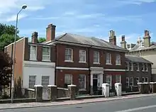 The increasing popularity of Brighton as a resort resulted in an "exponential growth in housing". In 1783,[43] just after the first expansion outside the ancient four-street village,[44] there were 600 houses; in 1801 there were 1,282, by 1811 another 1,096 had been completed, and in 1821 there were 4,299.[43] The land of Church Hill was ideal for development—land ownership was not complex, unlike in many of the laines, and the sheltered southwest-facing slopes were close to both St Ann's Well and the centre of Brighton's fashionable social scene around Old Steine. The area developed rapidly as a residential district from the 1820s, and was one of the earliest of Brighton's many 19th-century suburbs.[45][46] From 1823,[47] Read Kemp became heavily involved in his speculative Kemp Town estate on the edge of Brighton, and he moved to a house there in 1827 (after which The Temple became a boys' school).[31] He began selling plots of land throughout the area, and streets and areas of housing took shape.[32] Montpelier Road was one of the first to develop, on the site of the long track which had given Read Kemp access to the seafront from his house;[37][48] it is not named before 1820, but it appears on a map of 1822.[49] Houses such as numbers 53–56, by Amon Henry Wilds, and the semi-detached villas of numbers 91–96, date from about 1830.[50] Hampton Place, a sloping terrace of "especially pretty houses", was an 1820s development by speculator William Hallett, who occupied one of the houses himself.[51] Around the same time, Amon Henry Wilds and Charles Busby built several houses on a former track which became Clifton Road, and work started at Montpelier Terrace with the construction of a pair of villas in 1823.[32] Montpelier Lodge (c. 1830) on Montpelier Terrace stood out from the surrounding stuccoed buildings due to its red-brick walls; it also had an elaborate entrance with Doric columns and a delicately patterned fanlight.[52][53]