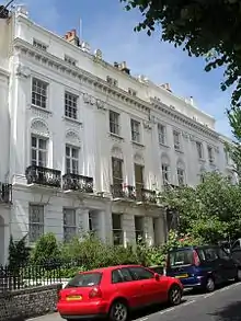 Ten pairs of "delightful" semi-detached villas, five on each side of the road, make up this mid-1840s development by Amon Henry Wilds.[37][116] They are in the Italianate style with influences of Regency architecture, and have two bow windows with bonnet-style canopies above, stuccoed walls with extensive rustication, prominently bracketed eaves and cast iron balconies.[37][116] The "charming" houses are set in spacious plots in a former bluebell wood.[37][65] The street was completed over the course of three years from about 1845.[65] All of the villas are listed buildings.[37]