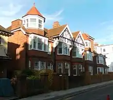 Some more houses were built in the Edwardian era, mostly in the characteristic Edwardian style with bright red brick "standing out amongst the stucco".[6] Examples include some in Temple Gardens and Vernon Gardens in the 1890s,[9] a row on one side of Denmark Terrace,[6] Windlesham Road (where numbers 14 and 16, built in 1903, are especially elaborate)[31] and 18–25 Clifton Road (1903–04, with ornate gables and turreted corners).[51] In 1902, the London & Brighton Express Electric Railway Company sought permission to build a new surface railway line from Westminster to a terminus near the junction of Montpelier Road and Western Road, passing Clifton Hill. Hove Council supported the parliamentary Bill, but nothing came of it; when the promoters proposed it again in 1903, the council were no longer interested.[69][70]