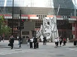 This is one of Dubuffet's three monumental sculpture commissions in the United States. It has been taken to represent a standing animal, a tree, a portal and an architectural form.[1] The sculpture is based on Dubuffet's 1960 painting series Hourloupe.[3] The sculpture and the series of figural and landscape designs it is a part of reflects his thoughts of earliest monumental commission, for the One Chase Manhattan Plaza.[3]