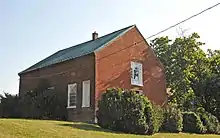 Morgan's original log cabin was constructed between 1731 and 1734.[5][12][37] This structure was rebuilt and restored with many of its original logs in 1976 as a West Virginia and Berkeley County Bicentennial Project.[5][12][37] Wood siding was added to the cabin's exterior in 1994 to protect the original logs.[12][37] Known as the Morgan Cabin, it is located on the Cool Spring Farm property 2.74 miles (4 km) west of the monument and Bunker Hill.[5][12][37] Morgan Cabin, Cool Spring Farm, and the surrounding 104 acres (42 ha) are owned by the Berkeley County Historical Landmarks Association and managed by a special committee of the association.[5][37]