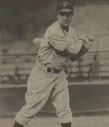 The Philadelphia Phillies purchased his contract in 1935, where he turned up for spring training with regulars remarking that "he'll never make it".[7] The Phillies assigned him to the Hazleton Mountaineers of the New York–Pennsylvania League where he hit .305.[2] In 1936, he hit .327 with 19 home runs and 109 runs batted in (RBI) in the minor leagues. He also played his first games in Major League Baseball in 1936, debuting September 14, 1936,[8] where he made .313 batting average over 13 games.[9] He moved to the outfield, playing mostly in left field for the rest of his career.[10] In 1937, he hit .290 and had a career-high five double plays from the outfield, and made seven consecutive hits.[2][10] In 1938, he made the most outfield assists of his career – 18.[10] He was referred to as the "Son of Israel", or the "Next Jewish Star" by the Anglo-Jewish press.[11][12]