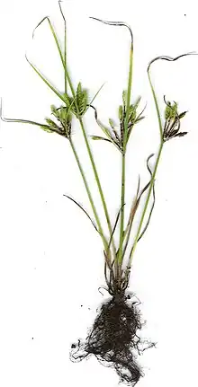 The annual sedge typically grows to a height of 0.1 to 0.75 metres (0.3 to 2.5 ft) and has a tufted habit. It blooms between May and December and produces green-yellow-brown flowers.[3] The erect and glabrous grass has fine and numerous roots. It as slender or rigidulous, trigonous stems that are 0.5 to 2.0 millimetres (0.020 to 0.079 in) thick. Red-purple, loose, open leaf sheaths cover the base of the plant with the leaves being much sorter than the stems. The leaves are greyish-green in colour with a narrowly linear shape and a width of 1.5 to 4.0 mm (0.06 to 0.16 in). The inflorescence is composed of umbellate spikes, with three to four rays hat are up to 8 centimetres (3 in) in length.[2] Following flowering it will form a dark brown to black trigonous nut that has a broad-obovoid shape. The nut is about 1.5 mm (0.059 in) in length with a diameter of about 1 mm (0.039 in).[4]