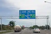 The Bangkok−Ban Chang Motorway (Thai: ทางหลวงพิเศษกรุงเทพมหานคร−บ้านฉาง, RTGS: Thangluang Phiset Krung Thep Maha Nakhon−Ban Chang), designated Motorway Route 7, is a motorway in Thailand, connecting Bangkok to Chonburi, Pattaya, and Map Ta Phut. The country's first intercity motorway, it is part of the Asian Highway Network as AH Route 19 and AH Route 123. The entire length from Bangkok to Pattaya is 125.865 kilometres (78.209 mi) and the posted speed limit is 120 kilometres per hour (75 mph), enforced primarily by speed cameras. An extension between Pong and Map Ta Phut opened in May 2020.[1] It is part of the transport network development project in the eastern seaboard.