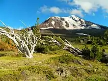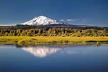 Adams, named for President John Adams, is a member of the Cascade Volcanic Arc, and is one of the arc's largest volcanoes,[7] located in a remote wilderness approximately 34 miles (55 km) east of Mount St. Helens.[8] The Mount Adams Wilderness consists of the upper and western part of the volcano's cone. The eastern side of the mountain is designated as part of the territory of the Yakama Nation.[9][10]