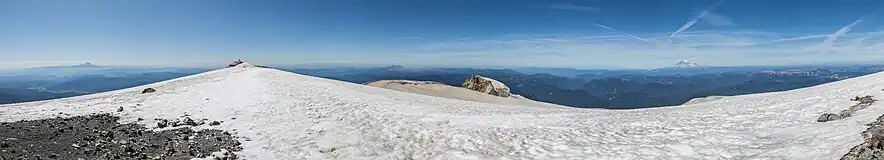 Panoramic view from the relatively flat summit area of Mount Adams, with the center of the image looking due west towards Mount St. Helens. Nine Cascade Volcanoes are visible (not including Adams itself). From left to right: Three Sisters complex, Mount Jefferson, Mount Hood, Mount St. Helens, Mount Rainier, Mount Baker, and Glacier Peak. The Olympic Mountains can be seen between St. Helens and Rainier, nearly 150 miles away.
