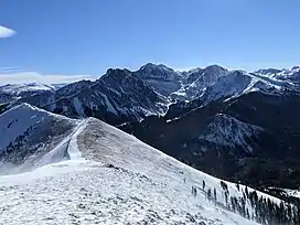 ![]() Mount Richthofen, the high mountain in the center, as seen from Diamond Peaks to the north. | |