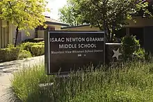 Isaac Newton Graham Middle School, known colloquially as Graham Middle School,[12] is located at 1175 Castro St., Mountain View, CA 94040.[7] The school mascot is the bear.[12] Before the district merger, the school was part of the Mountain View Elementary School District.[9]