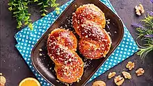In Moldova, they have the shape of the number 8, a stylization of the human form, and are baked from Cozonac dough, then glazed with honey and splinkled with walnuts.