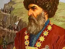 In 1751, the united army of the Dagestan feudal lords defeated the Georgian troops.[9] This was one of the most serious defeats for Teimuraz II and Heraclius II. According to Petr Butkov, in 1752/1753 he came to Georgia with the Lezgin army Mersel-khan (Muhammad-nutsal) and surrounded the Mchadis-Jvari fortress.[10] King Teimuraz in the first battle with him defeated and drove out the Lezgins, but then they gathered in Gartiskar and did not stop raiding Georgia. King Heraclius blocked their way and exterminated them all.[10] But the joy of a major victory over the Khunzakh ruler was overshadowed by continuous small raids that continued until 1760.[11]