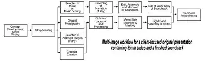 Multi-image is the now largely obsolete practice and business of using 35mm slides (diapositives) projected by single or multiple slide projectors onto one or more screens in synchronization with an audio voice-over or music track. Multi-image productions[1] are also known as multi-image slide presentations, slide shows and diaporamas and are a specific form of multimedia or audio-visual production.