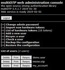 multiOTP is an open source PHP class, a command line tool, and a web interface that can be used to provide an operating-system-independent, strong authentication system. multiOTP is OATH-certified since version 4.1.0 and is developed under the LGPL license. Starting with version 4.3.2.5, multiOTP open source is also available as a virtual appliance—as a standard OVA file, a customized OVA file with open-vm-tools, and also as a virtual machine downloadable file that can run on Microsoft's Hyper-V, a common native hypervisor in Windows computers.