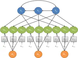 2) TSij = vij Fi + mij Mj where: vij is the validity coefficient, which is equal to: vij = σFi / σTSij Fi is the standardized latent factor for the ith variable of interest (or trait) mij is the method effect, which is equal to: mij = σMj / σTSij Mj is the standardized latent factor for the reaction to the jthmethod Consequently: vij2 = 1 - mij2 where: vij2 is the validity