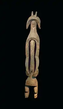 There are two types of masks found within Mumuye culture. There is the Sukwava mask. This shows a long neck and large ears. These were traditionally worn during ceremonies before war. Currently, they are used for healing, and rainmaking.[8]: 96 The other mask worn by the Mumuye is a face mask used for initiation. This mask has hallowed out eyes.[8]: 96 It has animalistic features, and a skeletal quality. This creation is consistent with the tradition of human-animal fusion within masks.[10]: 228
