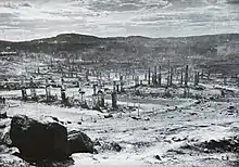 German forces in Finnish territory launched an offensive against the city in 1941 as part of Operation Silver Fox. Murmansk suffered extensive destruction, the magnitude of which was rivaled only by the destruction of Leningrad and Stalingrad.[22][23] However, fierce Soviet resistance and harsh local weather conditions with the bad terrain prevented the Germans from capturing the city and cutting off the vital Karelian railway line and the ice-free harbor.