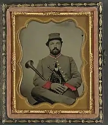 There were two types of musicians in both armies. Each company was generally authorized two musicians whose job was to announce daily activities when in camp or garrison (i.e. reveille, taps). During battle they would signal various commands, such as when to attack or retreat, as otherwise the orders could not be heard over the din of combat.[2] These would be trumpeters for cavalry, buglers for field artillery, or a drummer and a fifer for infantry, heavy artillery and engineers. Trumpeters were armed with sabres and pistols while the rest were armed only with a musician's sword. While not expected to perform the ordinary duties of a soldier in camp, musicians could be used for fatigue duty. It was also common practice to recruit boys under the age of eighteen as musicians with their parents' or guardians' consent.[3] The second type were musicians who formed dedicated bands assigned to brigades and some regiments. Bands would perform for special occasions such as during inspections and parades, and would put on concerts to entertain the troops and visiting dignitaries.[2] Artillery and volunteer infantry regiments were authorized a band of twenty-four musicians, while volunteer brigades were authorized bands of sixteen musicians.[3]