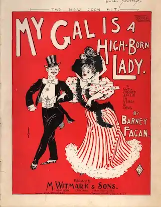 "My Gal is a High-Born Lady" (Alternative titles: My Gal is a High Born Lady, My Gal's a High Born Lady) is a minstrel song was written by Barney Fagan and Gustav Luders (music)[1] in 1896.[2] It was a favourite well into the first half of the 20th century and is still performed today,[3] often in bluegrass style.[4] Its unusual ragtime rhythm is regarded as seminal in the later popularity of the Foxtrot.[5] The original lyrics are offensive to modern culture due to their racial stereotypes and the song is notable for how often it has been performed with altered lyrics (e.g. the Looney Tunes cartoon Long-Haired Hare).