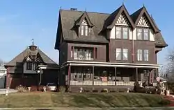 The three-story frame Queen Anne house was designed by local architect William D. McLaughlin. It is influenced by the phase of the style developed by Richard Norman Shaw in England.[2] The house has irregular massing with a vertical emphasis. It features clapboard on the first floor, shingles on the second floor, and half-timbering on the third. A full-length porch is located on the main facade, and a porte-cochère on the north elevation. Two porches were carved into the second floor, but one has been removed.[2] The two-story carriage house behind was built after the main house, and is sympathetic in design. The two buildings were listed together on the National Register of Historic Places in 2004.[1]