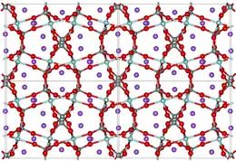 The crystal structure of NASICON compounds was characterized in 1968. It is a covalent network consisting of ZrO6 octahedra and PO4/SiO4 tetrahedra that share common corners. Sodium ions are located at two types of interstitial positions. They move among those sites through bottlenecks, whose size, and thus the NASICON electrical conductivity, depends on the NASICON composition, on the site occupancy,[3] and on the oxygen content in the surrounding atmosphere. The conductivity decreases for x < 2 or when all Si is substituted for P in the crystal lattice (and vice versa); it can be increased by adding a rare-earth compound to NASICON, such as yttria.[1]