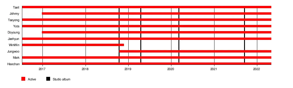 ![]() NCT 127 in October 2018 From left to right: Johnny, Haechan, Mark, Winwin, Taeyong, Jaehyun, Yuta, Taeil, Jungwoo, and Doyoung | |