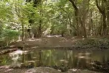 The forested area which is immediately intertwined with the sandy beach is rich with unique trees particular to this area.[5][6] In the background, the forests merge with Mount Shahdagh of Greater Caucasus Mountain range.[1] Due to absence of manufacturing industry and low population density, the sea water is clean compared to heavily industrialized Absheron Peninsula.[1] Nabran area is rich with clean drinking water flowing from Mount Shahdagh. In the early 1900s, at Haji Zeynalabdin Taghiyev's initiative, a project was started with an intention to pump the clean drinking water from the area to Baku. The pipe would start from Shollar village and travel south to Hacı Zeynalabdin village (formerly known as "Nasosnaya" meaning pumping station in Russian) in the vicinity of Baku where it would be pumped to the higher ground on which Baku is located. The project was completed in 1917.[7]