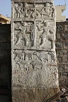 The Nageshvarasvami temple, also a Western Ganga construction, faces east, has a square plan for the sanctum, a vestibule, an open hall, a detached hall called mukha-mantapa whose ceiling is supported by eight pillars. An image of Nandi is placed in the mukha-mantap making it serve the purpose of a Nandi-mantapa (Nandi hall). The base of the entrance (dvara) is flanked by niches with images of Ganga-Yamuna figures with attendant ladies. This appears to be a Chalukya-Rashtrakuta influence.[4]