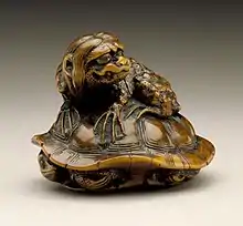 Kappa astride on turtle netsuke out of wood, first half of 19th century, by Naitō Toyomasa