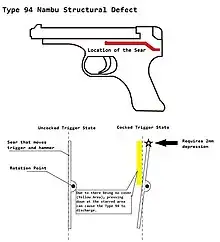 The design of the breech allows the Type 94 Nambu to be fired unintentionally.[3] The sear bar on the Type 94 Nambu converts the forward pull of the trigger into a lateral movement that frees the hammer.[19] Because the sear bar is on the outside of the pistol,[19] it can be accidentally discharged if the pistol is cocked and handled carelessly.[6] The forward end of the sear bar needs to be depressed approximately 2 mm to cause the weapon to fire.[5] However the sear bar cannot be despressed to cause an unintentional discharge while the safety is engaged. The ability to fire the Type 94 without pulling the trigger gave rise to war stories of Japanese soldiers surrendering, only to fire the pistol, earning the pistol monikers such as the "suicide special" and the "surrender pistol".[5] These stories are widely discredited because of the difficulty to fire the weapon by squeezing the sear bar.[5] If the safety is engaged on the Type 94 it is impossible for the weapon to discharge unintentionally.[1]