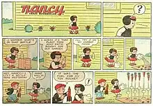 Nancy is an American comic strip, originally written and drawn by Ernie Bushmiller and distributed by United Feature Syndicate and Andrews McMeel Syndication.[1] Its origins lie in Fritzi Ritz, a strip Bushmiller inherited from its creator Larry Whittington in 1925. After Fritzi's niece Nancy was introduced in 1933, Fritzi Ritz evolved to focus more and more on Nancy instead of Fritzi. The new strip took the old one's daily slot, while Fritzi Ritz continued as a Sunday, with Nancy taking the Sunday slot previously filled by Bushmiller's Phil Fumble strip beginning on October 30, 1938.[2]
