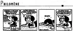 • Quino's Mafalda bears a strong resemblance to the earlier Nancy, which Quino mocks in one strip, where Miguelito buys a Nancy magazine and shows it to Mafalda noticing the resemblance, only for Mafalda to retort (off-frame) that she looks more like his grandmother.[82]