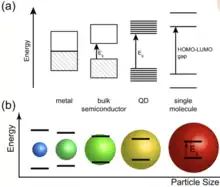 The fluorescence of colloidal semiconductors is another property analyzed in creating sensor systems. Quantum dots are semiconducting nanoparticles which are small enough to confine a generated hole-electron pair in all three spatial directions, leading to quantization of the energy levels causing the electronic structure of the material to sit between a classical semiconductor and a classic molecular material. This quantization causes nanoparticles to display sharp photon absorption and emission bands, and the band gap is closely related to the size of the nanoparticle. Fluorescence arises from photoexcitation in these quantum dots and is easily tuned to the visible or near infrared region of the spectrum, by choice of semiconductor material and particle size, making quantum-useful fluorophores. Quantum dots have many properties of interest in order to be used as chemical sensors, including their high fluorescent quantum yields, resistance to photobleaching, and broad absorption allowing for narrow emission bands. They lend themselves nicely to multichannel fluorophore systems, with single excitation wavelength causing emission from many species of many different colors. The surface of these particles can be changed with targeting ligands to allow specific fluorescent enhancement. These optical properties of quantum dots are being exploited to build an explosive sensing array of dots. By combining multichannel fluorophore systems with variable response to different explosives, it is possible to identify different explosives at low concentrations. This technology can be used in wastewater or ground pollution, as well in areas of hazardous waste to identify areas of threat or contaminated substances that could cause health risks to people and animals.[18]