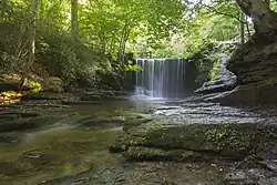 A waterfall in its woodlands, downstream along the River Clywedog, from the park's visitor centre.
