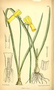 It is a vigorous bulbous perennial, growing to 15–20 cm (6–8 in) tall, with grass-like leaves, and yellow flowers in early Spring. The 4.5 cm long, pendent flowers are unusual in that the central trumpet (corona) is long and narrow, while the outer section (perianth) is fully reflexed (folded back on itself).[1] This reflexion superficially resembles that of the distantly related cyclamen.