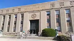 In preparation for the new county, in November 1898, voters had selected Mineola to become the county seat for the new county[28] (before Mineola incorporated as a village in 1906 and set its boundaries almost entirely within the Town of North Hempstead), winning out over Hicksville and Hempstead.[29] The Garden City Company (founded in 1893 by the heirs of Alexander Turney Stewart)[30] donated four acres of land for the county buildings in the Town of Hempstead, just south of the Mineola train station and the present day village of Mineola.[31] The land and the buildings have a Mineola postal address, but are within the present day Village of Garden City,[32] which did not incorporate, nor set its boundaries, until 1919.