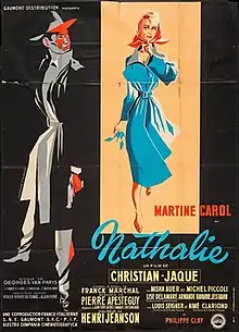 Nathalie is a 1957 French-Italian comedy crime film directed by Christian-Jaque and starring Martine Carol, Mischa Auer and Michel Piccoli.[1][2] It was shot at the Joinville Studios of Franstudio and the Photosonor Studios, both in Paris. Location shooting also took place around the city including the Printemps department store and Paris Airport. The film's sets were designed by the art director Robert Gys. It was followed by a sequel Nathalie, Secret Agent in 1959, also starring Carol.