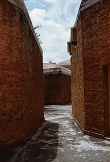 From the top of the golf course's ravine, one looks down upon the ballet school complex, nestled into the descending gorge. The plan of the school is articulated by a cluster of domed volumes, connected by an organic layering of Catalan vaults that follow a winding path. There are at least five ways to enter the complex. The most dramatic entrance starts at the top of the ravine with a simple path bisected by a notch to carry rainwater. As one proceeds, the terra cotta cupolas, articulating the major programmatic spaces, emerge floating over lush growth. The path then descends down into the winding subterranean passage that links the classrooms and showers, three dance pavilions, administration pavilions, library and the Pantheon-like space of the performance theater. The path also leads up onto its roofs which are an integral part of Garatti's paseo arquitectonico. The essence of the design is not found in the plan but in the spatial experience of the school's choreographed volumes that move with the descending ravine.[15]