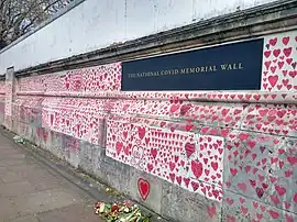 The National Covid Memorial Wall in London is a public mural painted by volunteers to commemorate victims of the COVID-19 pandemic in the United Kingdom.[1] Started in March 2021 and stretching more than one-third mile (five hundred metres) along the South Bank of the River Thames, opposite the Palace of Westminster,[2] the mural consists of approximately 240,000 red and pink hearts, one for each of the casualties of COVID-19 in the United Kingdom who died with COVID-19 on their death certificate.[3] The intent was for each heart to be "individually hand-painted; utterly unique, just like the loved ones we’ve lost".[4]