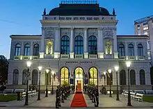 The present building was built in 1896, during the administration of Mayor Ivan Hribar, whose ambition was to transform Ljubljana into a representative capital of all the Slovene Lands.[3] It was designed by the Czech architect František Škabrout[4] and was first used as a Slovenian cultural center (Narodni dom) as the central seat of various cultural associations of national importance. The building stands near Tivoli Park and was completely renovated in 2013-2016.