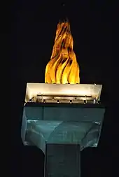 Monas is topped by a 14.5 ton bronze Flame of Independence containing the lift engine. The base of the flame, in the shape of a goblet, is 3 metres high. The bronze flame structure measures 14 metres in height and 6 metres in diameter, It consists of 77 sections. Originally the bronze flame structure was covered with 35 kg[2] of gold leaf. For the 50th anniversary of Indonesian independence in 1995, the gold leaf was reapplied and increased to 50 kg[10] of gold.